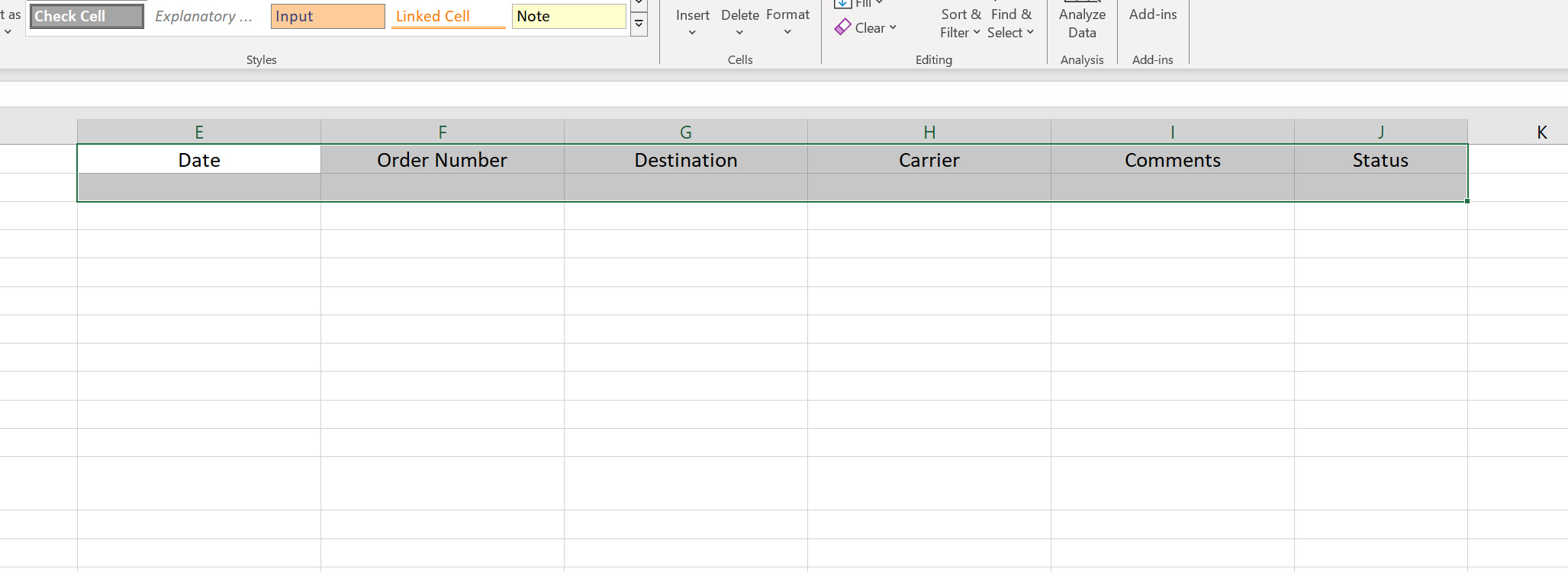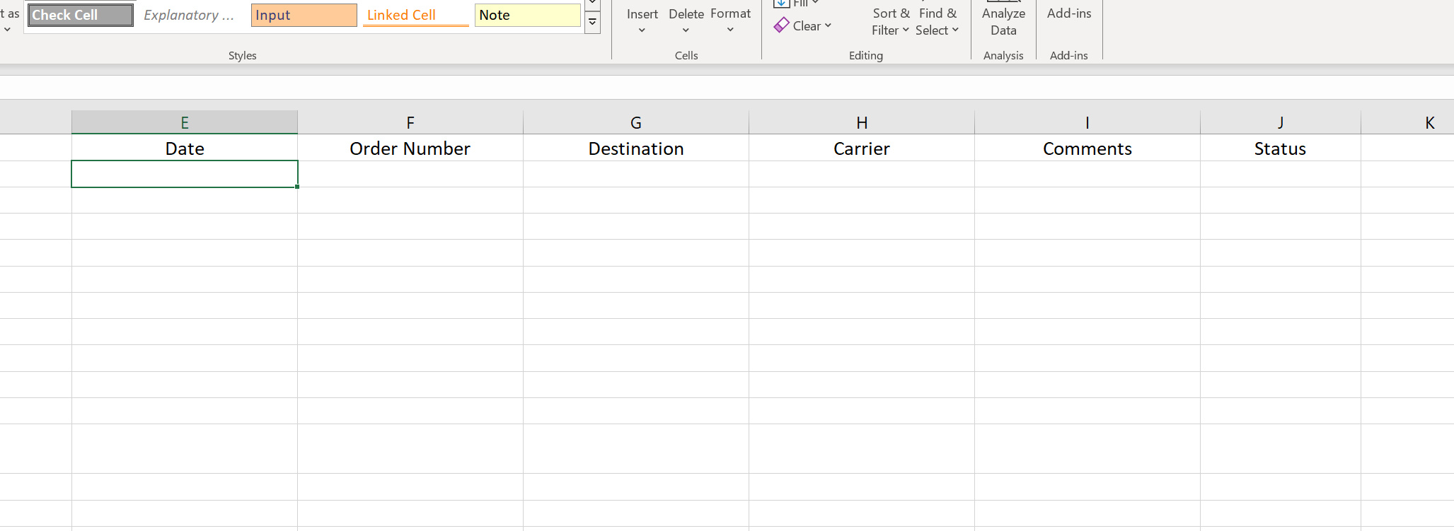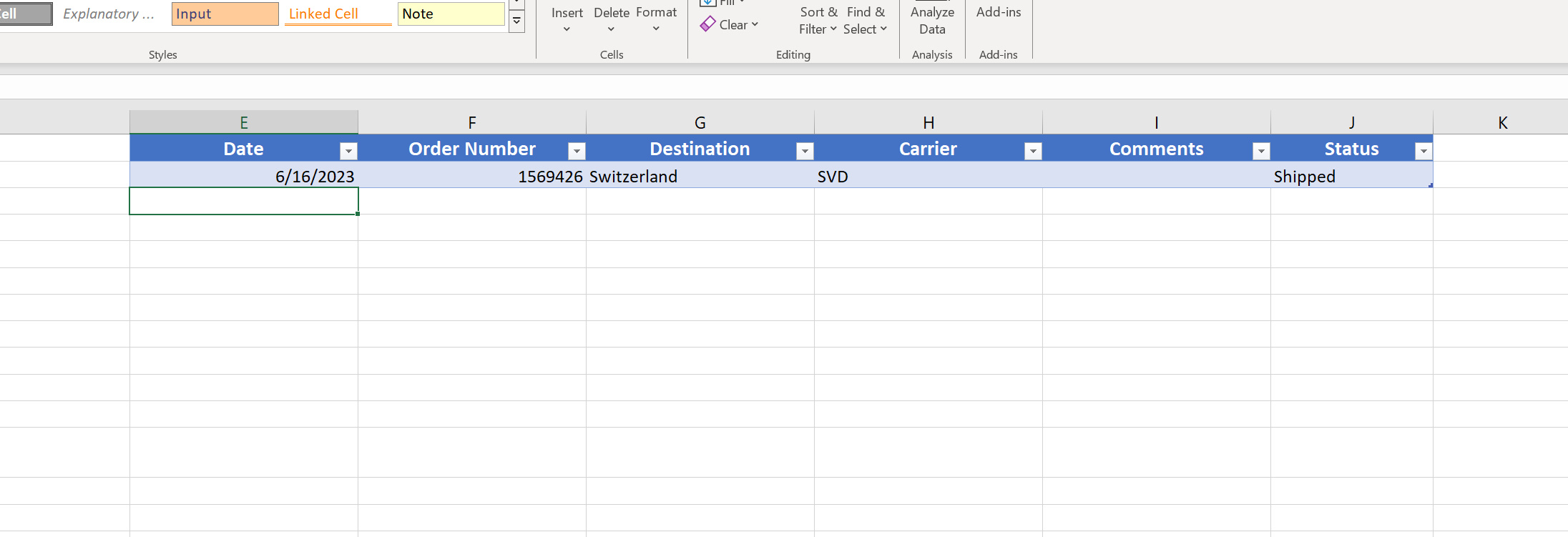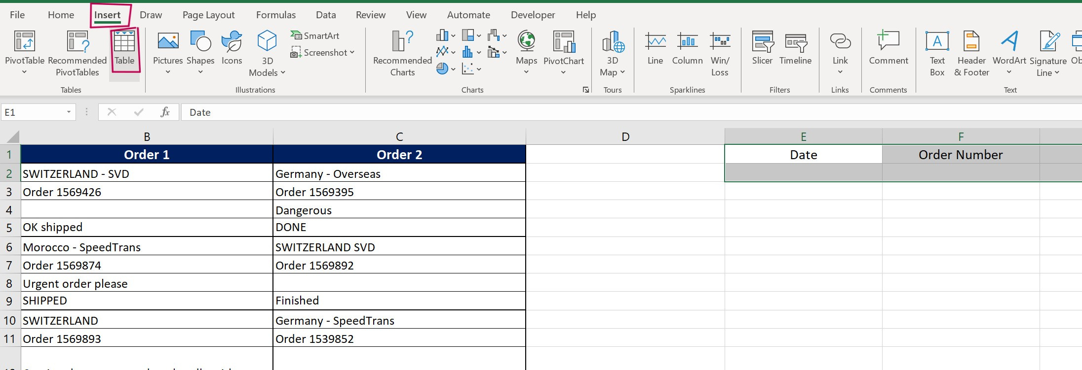 Simply click on cell E3 and add the date of the second order. A new line should have been created automatically (you can see this by the blue border around the line and the presence of "Table Design" in the Ribbon).