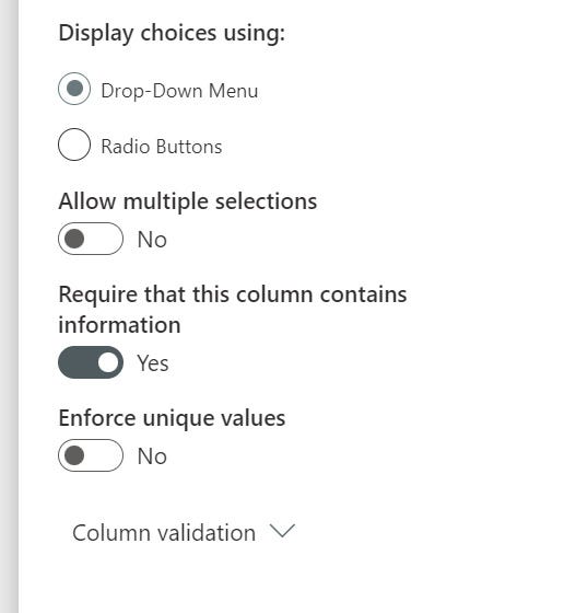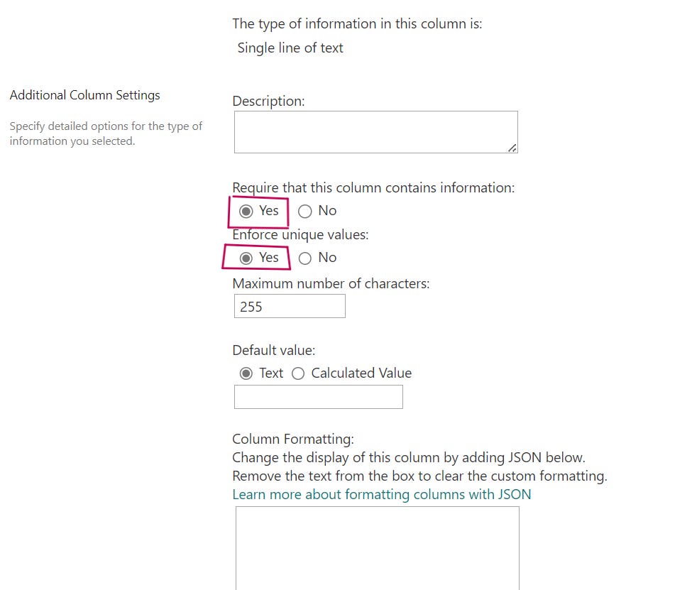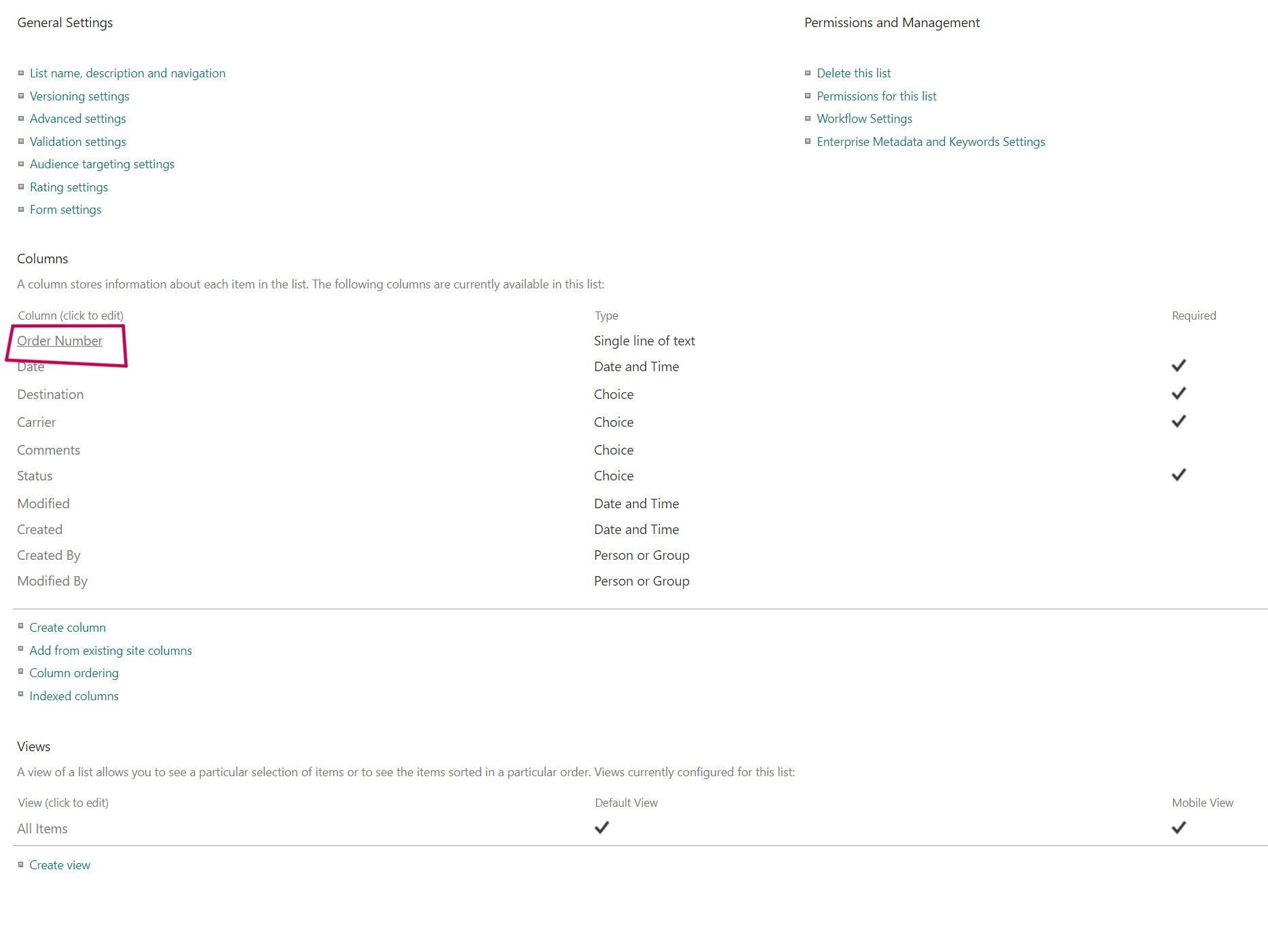 All we have to do is click "Yes" to the question "Require that this column contains information" and also “Yes” to enforce unique values in order to avoid having two similar order numbers: