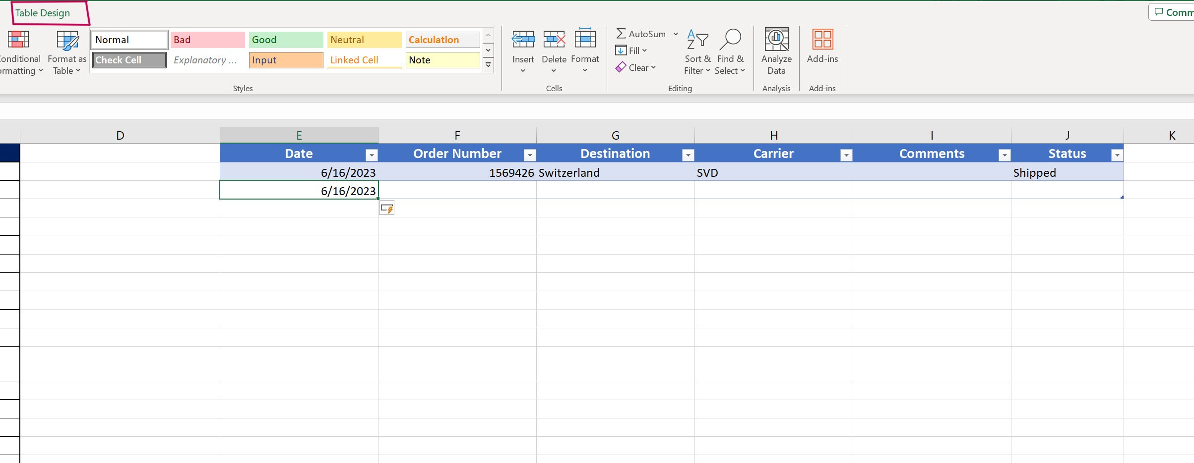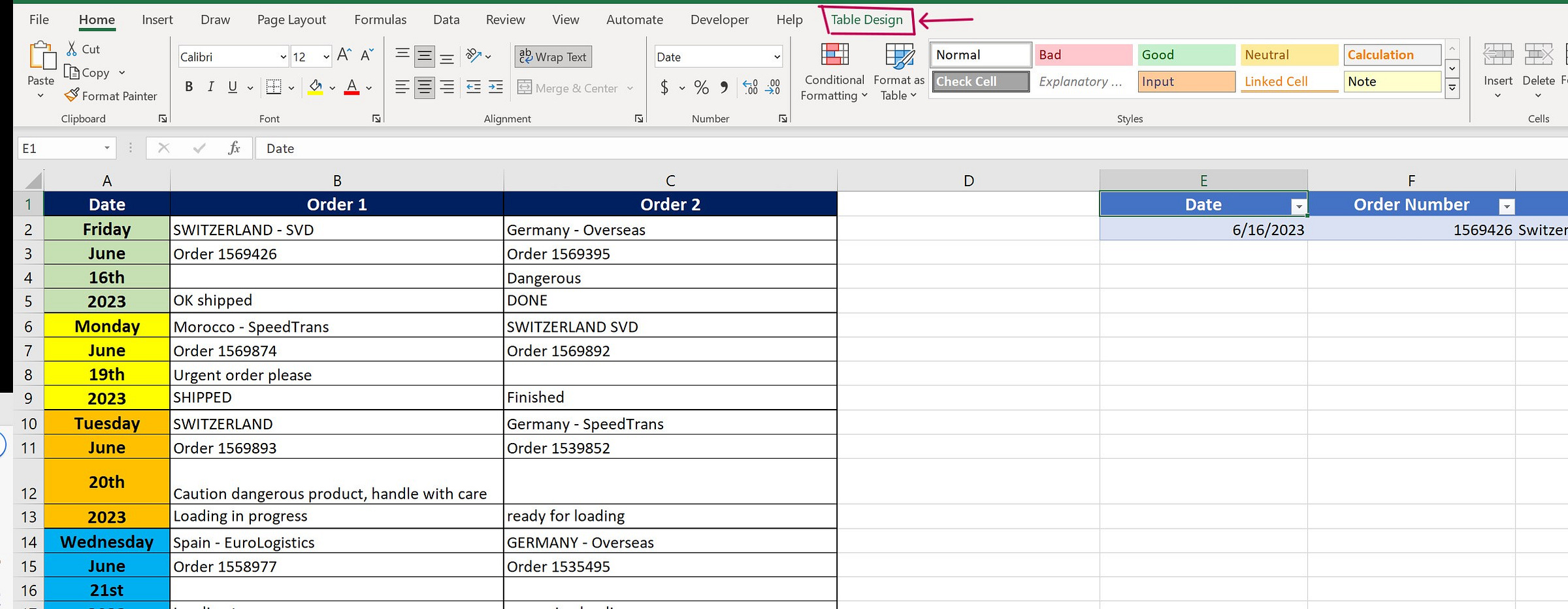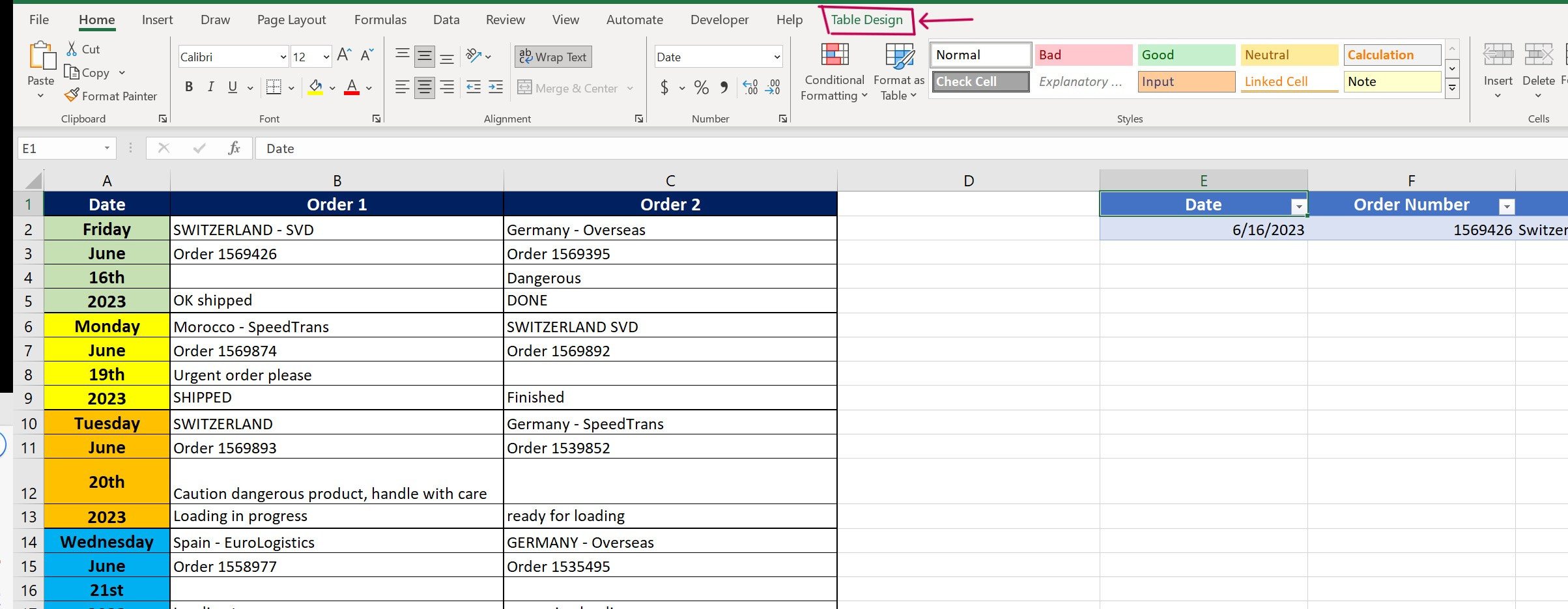 If not: click on cell E1 ("Date") and go to "Table Design" (as indicated in my screenshot):