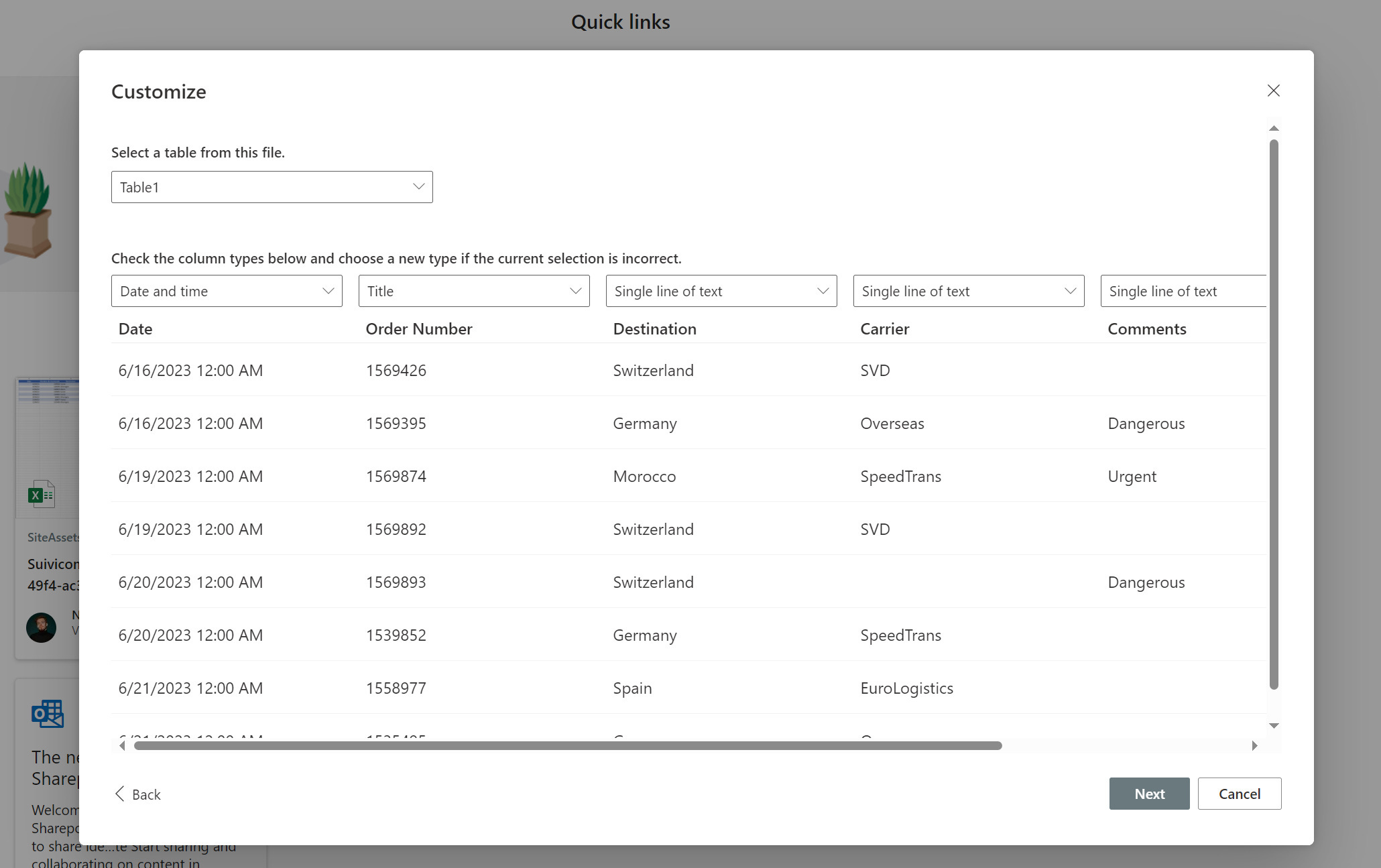 Notice something interesting: it only suggests "Table1", as the previous table with our bulk data is not recognized by SharePoint.