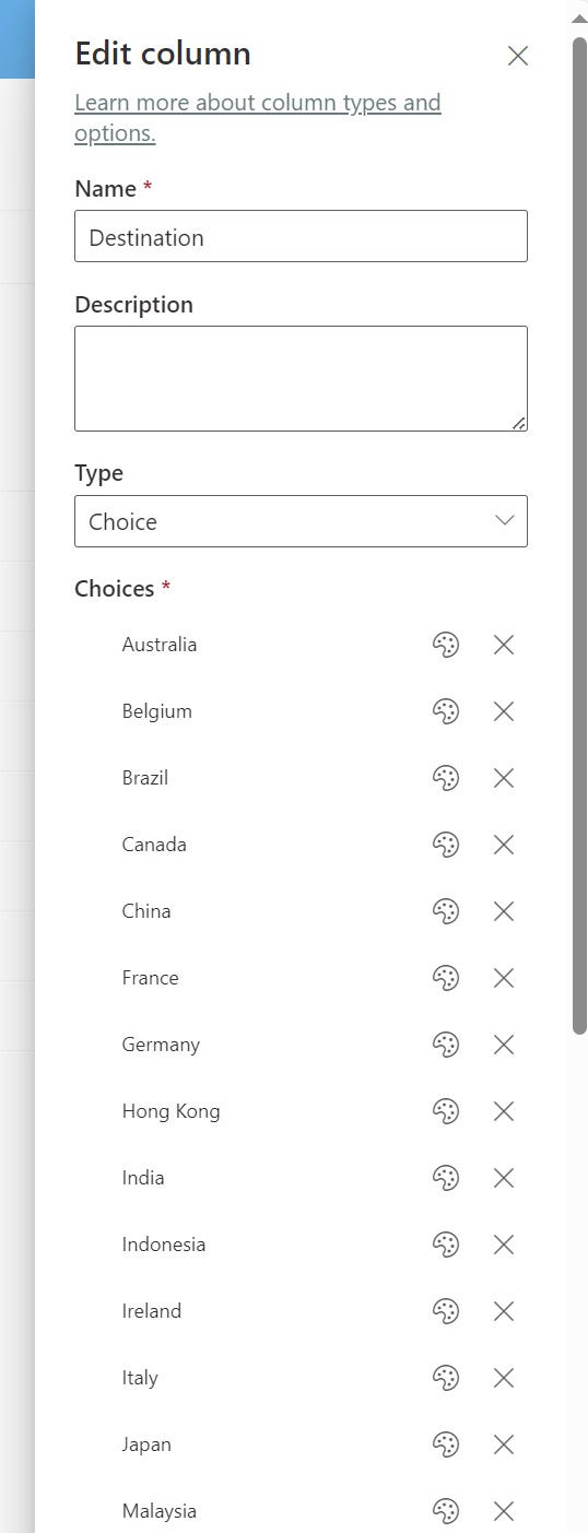 After saving, let's go to the "Destination" column to add the names of the countries we trade with. One country corresponds to one choice.