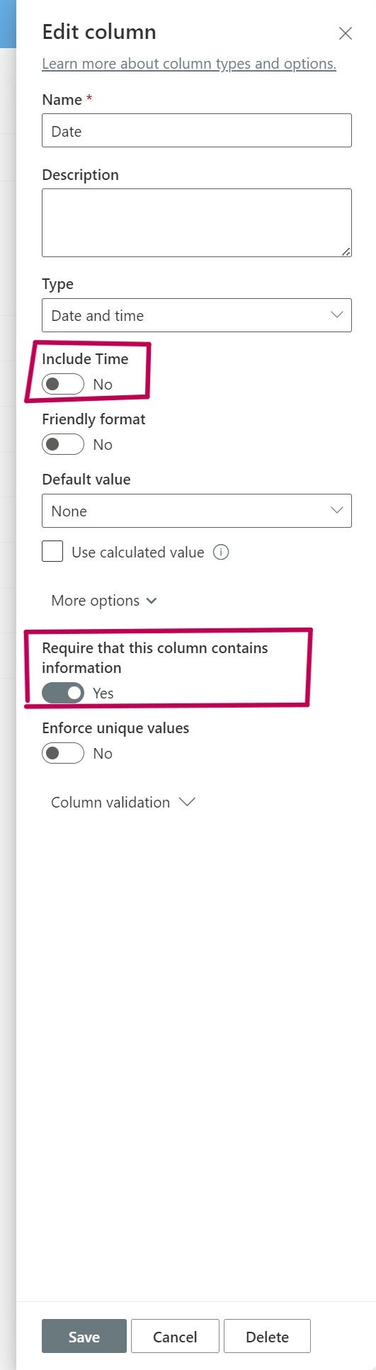 In the window that opens on the right, we're going to uncheck "Include time" and take the opportunity to make the addition of information in this column compulsory, as follows: