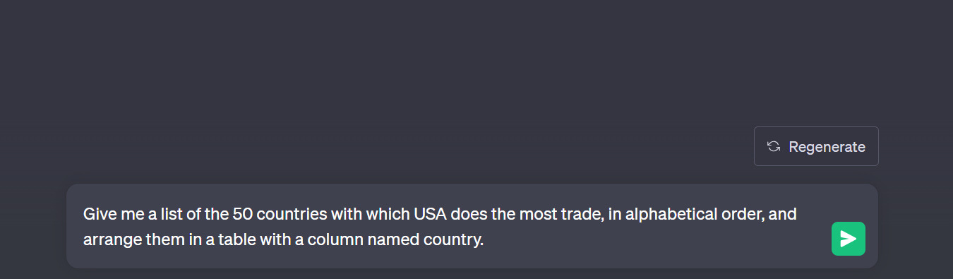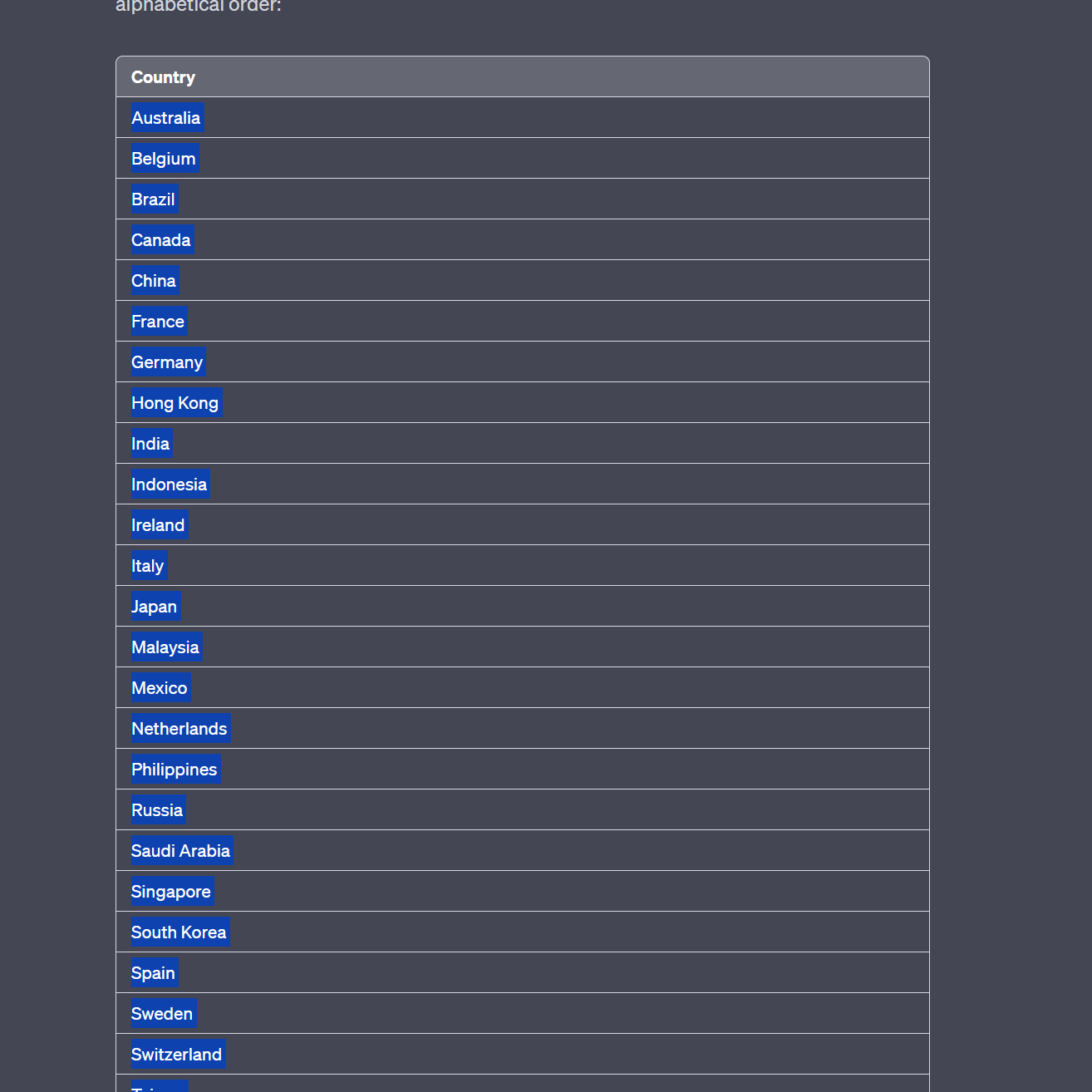 "Give me a list of the 50 countries with which USA does the most trade in alphabetical order and arrange them in a table with a column named country"