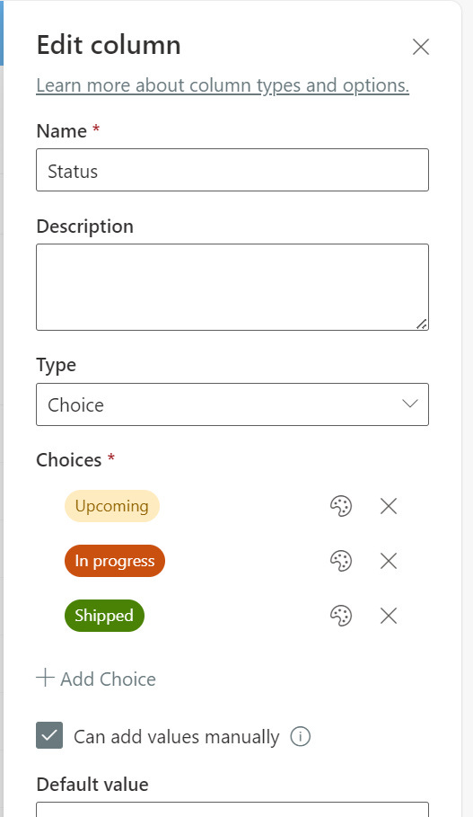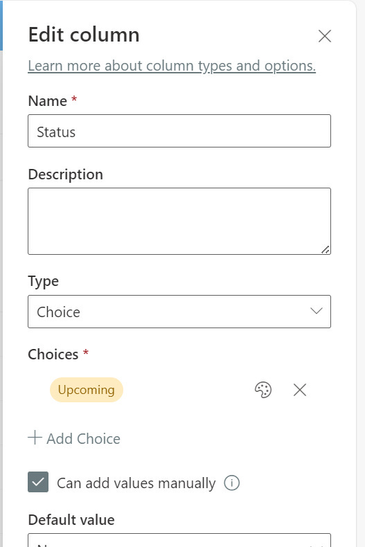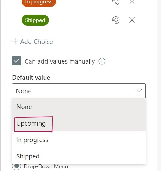 We'll simply click on "Add choice" and fill in Upcoming. On the palette to the right of the text, for example, we'll select the color yellow. Our choice should look like this: