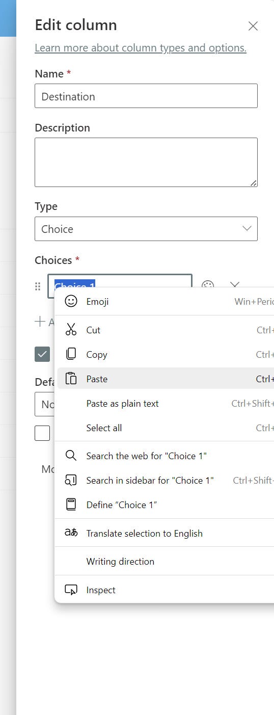 Then go back to your list, select "Add choice" and on "Choice 1", right-click and paste.