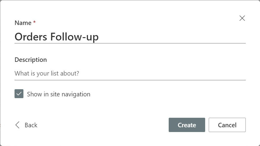 We can click on Next and call our new list "Orders Follow-up" and leave "View in site navigation" ticked for easy retrieval.