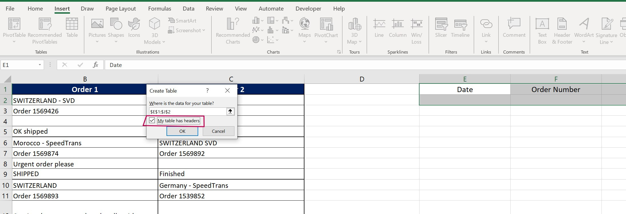 Then widen the scope of the Table by renaming "$E$1:$J$2" to "$E$1:$J$3" and click Ok.