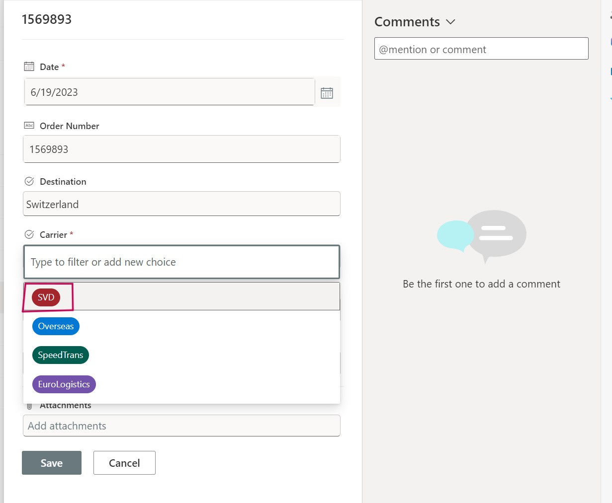 We can add the carrier "SVD" in the missing field and see that our list of choices appears correctly as below: