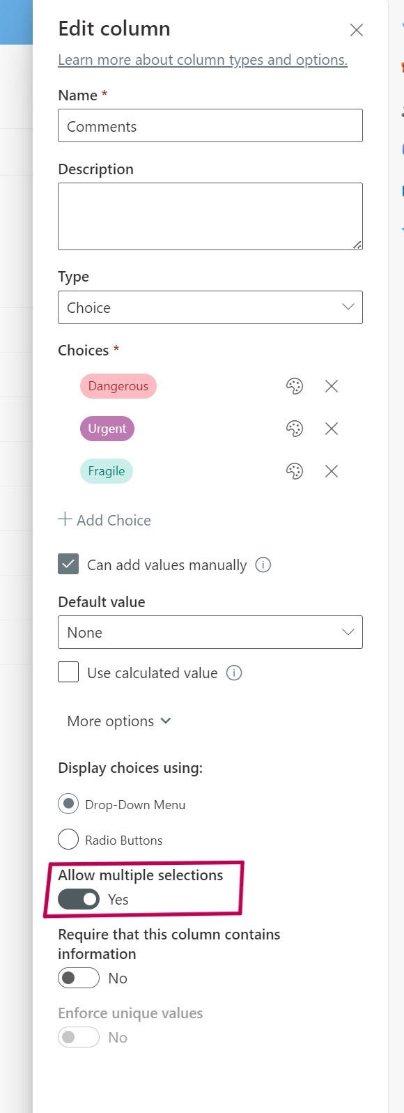There's also a peculiarity: an order could be both "Fragile" AND "Urgent". So we're going to allow users to select more than one choice if they need to, by clicking on "Allow multiple selections". Your window should look like this: