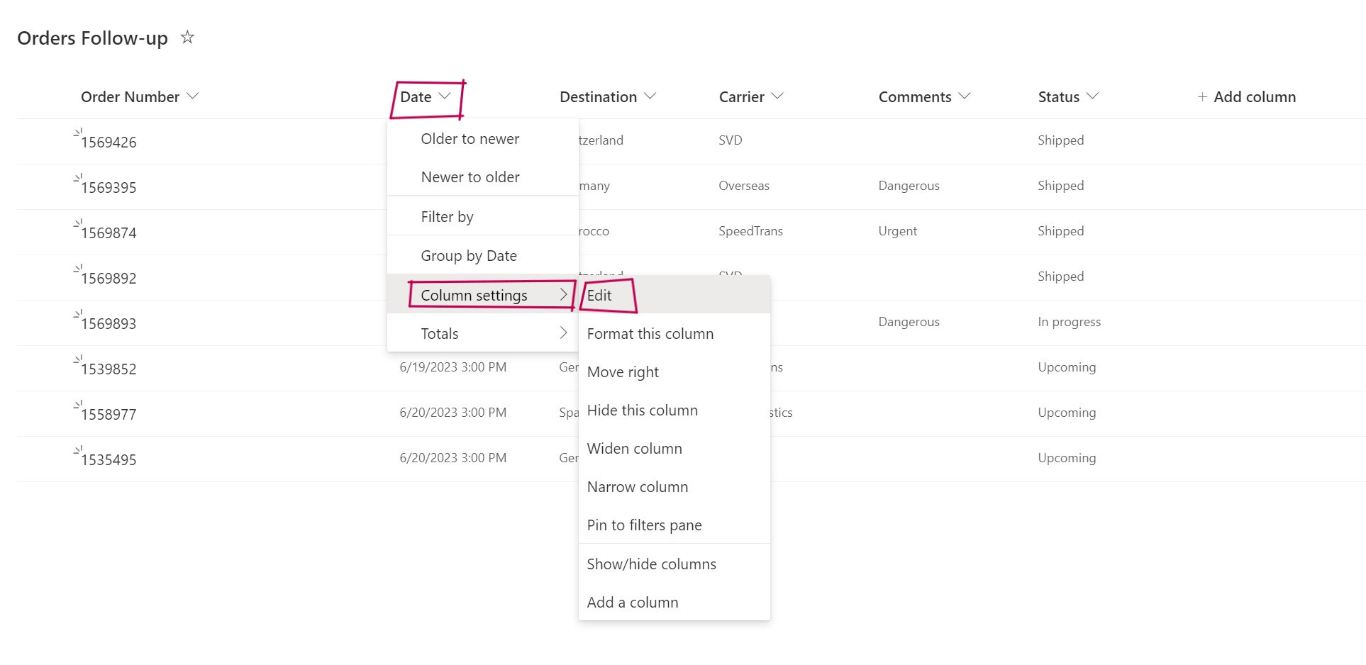 To do this, we'll click on the "Date" column, then "Column parameters" and "Modify".